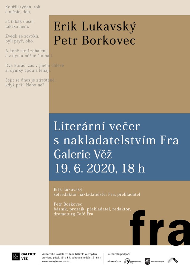 O nakladatelství Fra, jeho náročné objevitelské cestě, o vydávání bez ústupků, o životě v psaní a překládání, o mimořádném a živém literárním úkazu Café Fra si budeme povídat s Erikem Lukavským, zakladatelem Fra, šéfredaktorem a překladatelem a s Petrem Borkovcem, básníkem, prozaikem, překladatelem, redaktorem a dramaturgem Café Fra.